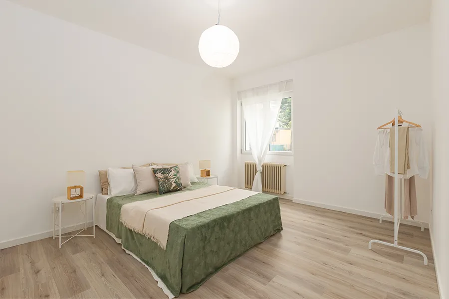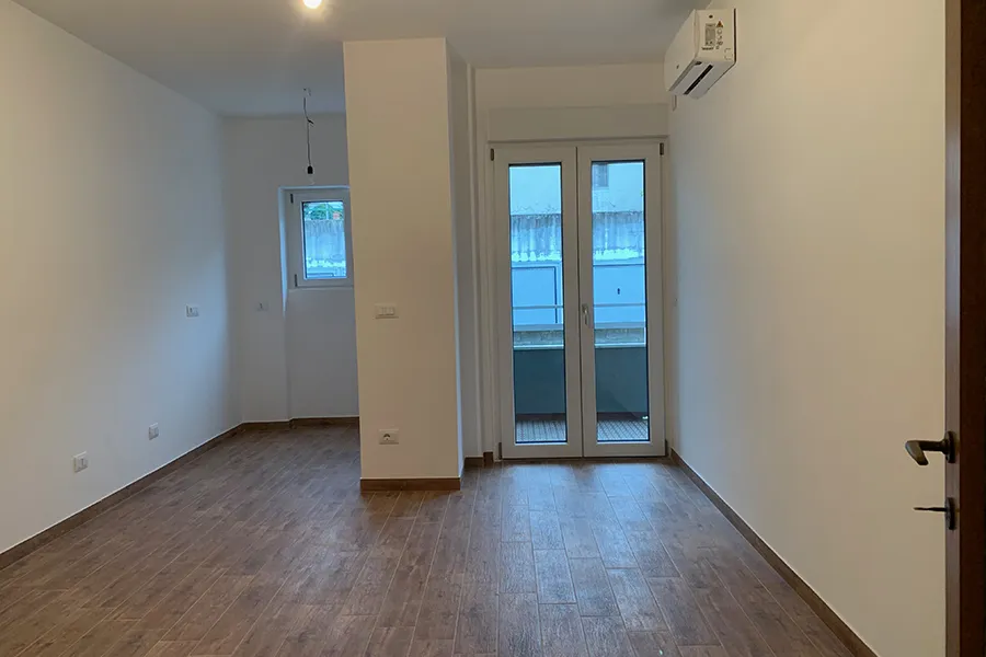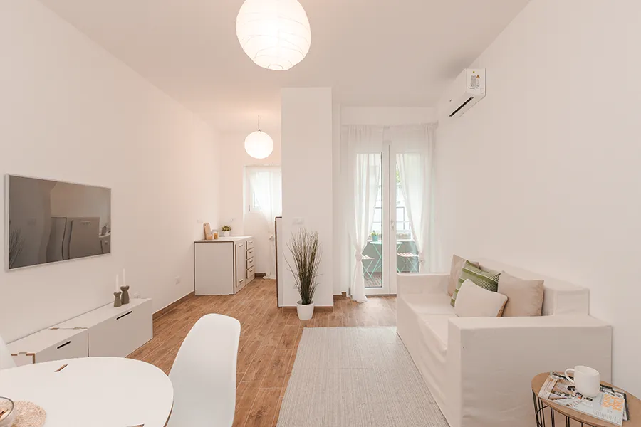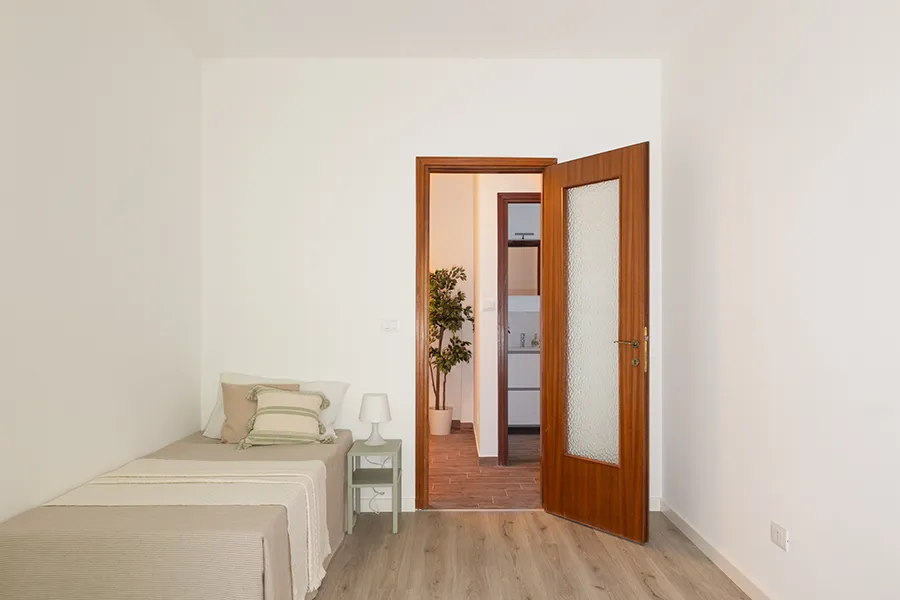 L’appartamento di via Pinguente 10, a Trieste, era fresco di ristrutturazione ma privo di arredi. Nonostante le camere fossero ampie, il soggiorno con angolo cottura risultava contenuto, penalizzato da una posizione al piano basso, affacci chiusi e finiture economiche dai toni freddi. Così com’era, rischiava di apparire poco accogliente e difficile da vendere rapidamente.
