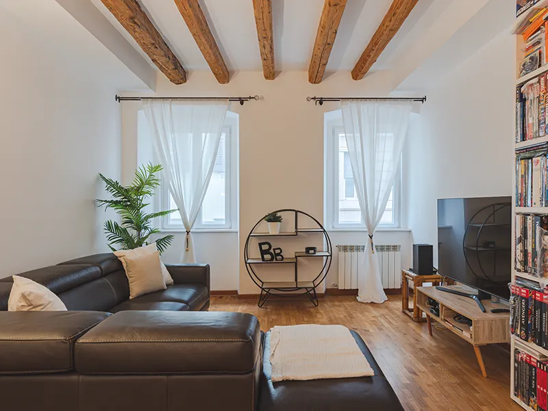 - Tende leggere e nuove lampade hanno illuminato il soggiorno, valorizzando le travi a vista e i dettagli architettonici.